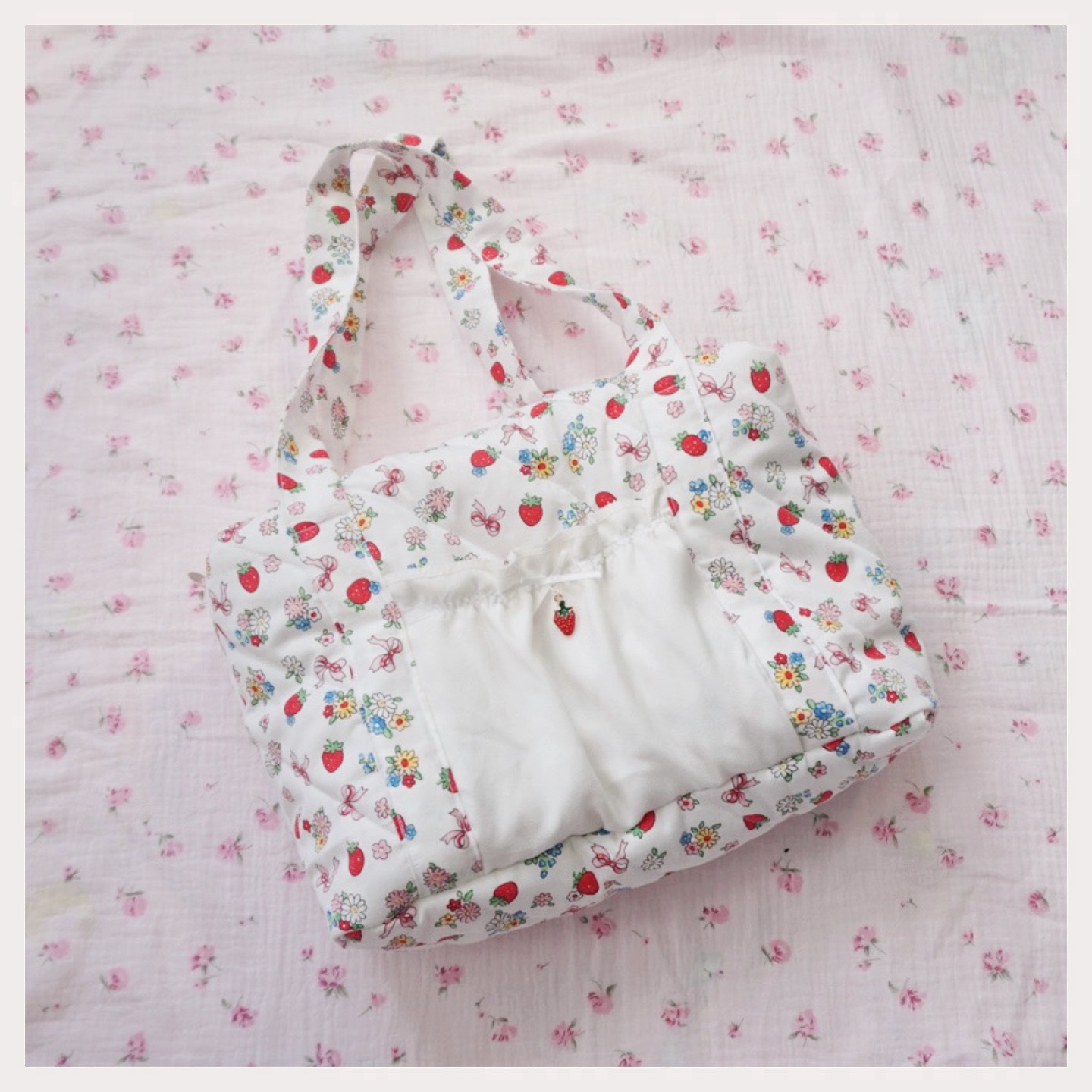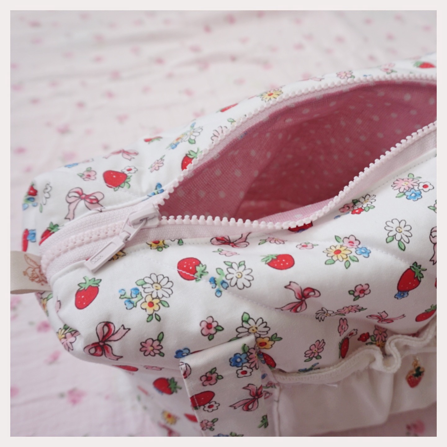 - Màu : strawberry garden (trắng họa tiết dâu hoa, lót hồng chấm bi)
